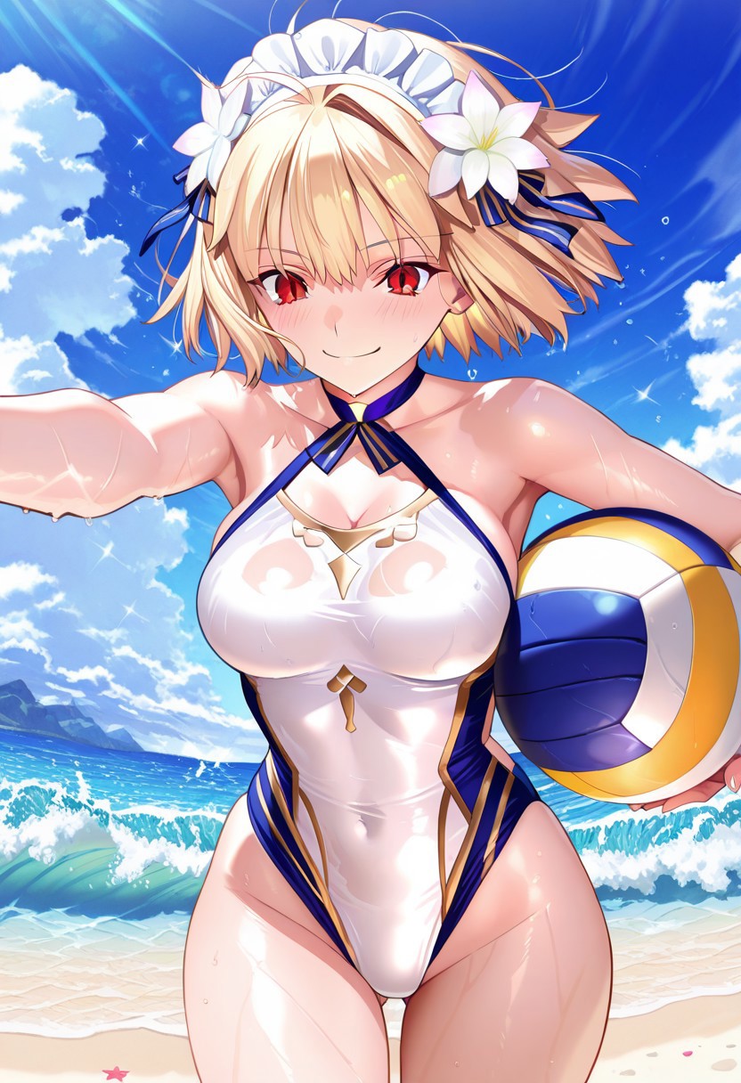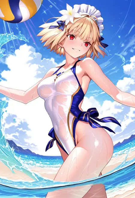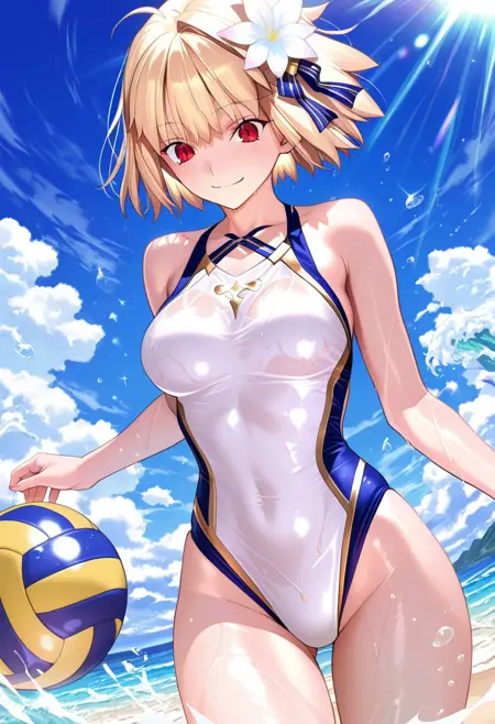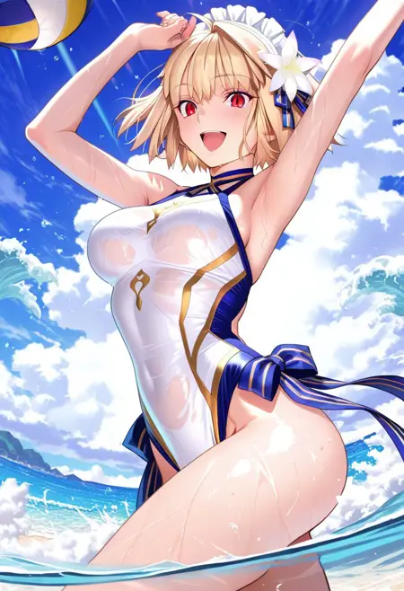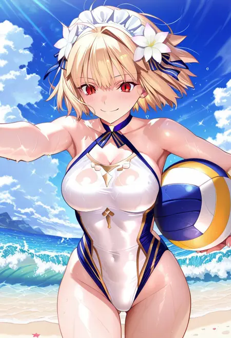 泳装:1girl,arcuied,blonde hair, red eyes, short hair,swimsuit,White flower headdress, white swimsuit, gold stripes, blue ribbon,
