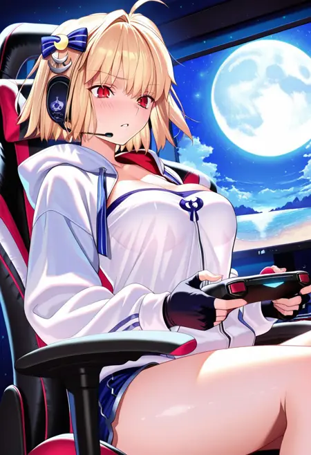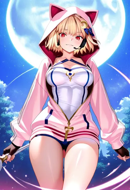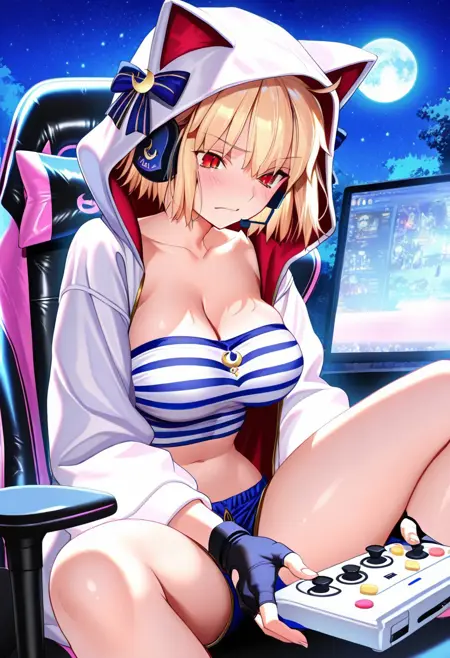 Phantasmoon 第2套:1girl,arcuied,blonde hair, red eyes, short hair,animal ears, magic wand, moon hair ornament, hair bow, headset, tube top, hoodie, animal hood, fingerless gloves. striped highthighs