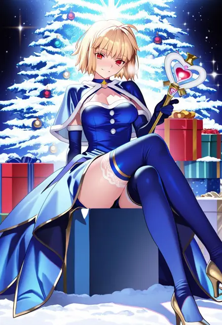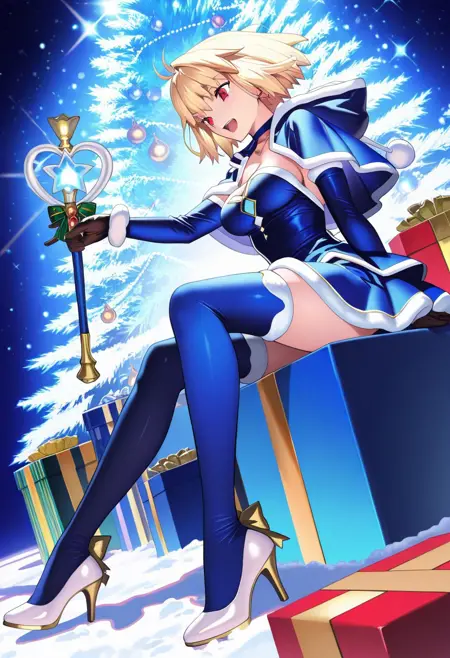 Phantasmoon 第3套:1girl,arcuied,blonde hair, red eyes, short hair,high heels,sitting,gloves,box,gift,Christmas Costumes,Blue stockings, magic wand, lace,