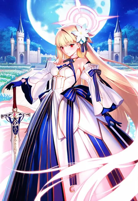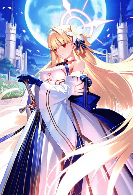 第2套:1girl,arcuied,blonde hair, red eyes,absurdly long Hair,long dress, ribbon, too many ribbons, hair flower, detached sleeves, wide sleeves, blue gloves,Sword, Halo,