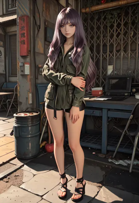 kaya, long hair, purple hair, jacket, long sleeves, pocket, green jacket, sandals, high heels, toes, shorts, bike shorts