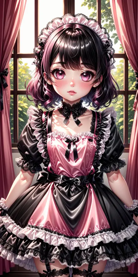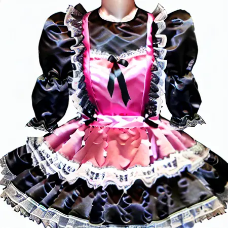| Trained Words | black pink and white short lace-trimmed shiny satin puffy maid_dress, black lace-trimmed puffy short sleeves, white lace trim, (white lace_trim on black puffy short sleeves), black small chest ribbon, black and white short attached layered lace-trimmed dress_skirt, (pink and black long shiny satin ribboned lace-trimmed apron), black ribbon_trim, ((black ribbon trim on pink long shiny satin lace-trimmed apron), black bowsCopied! |