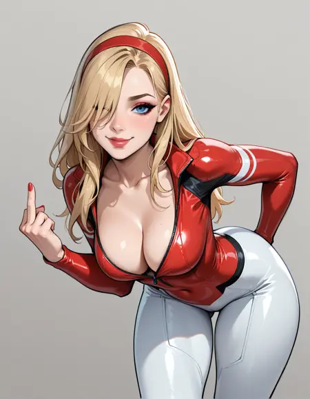 女性角色向前倾身,同时竖起中指展示她的胸脯。