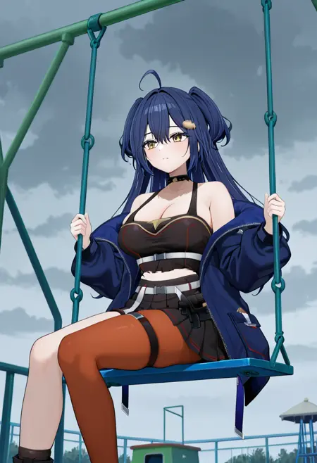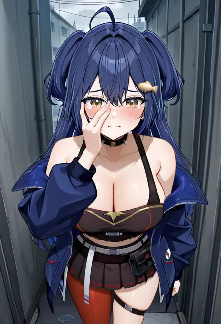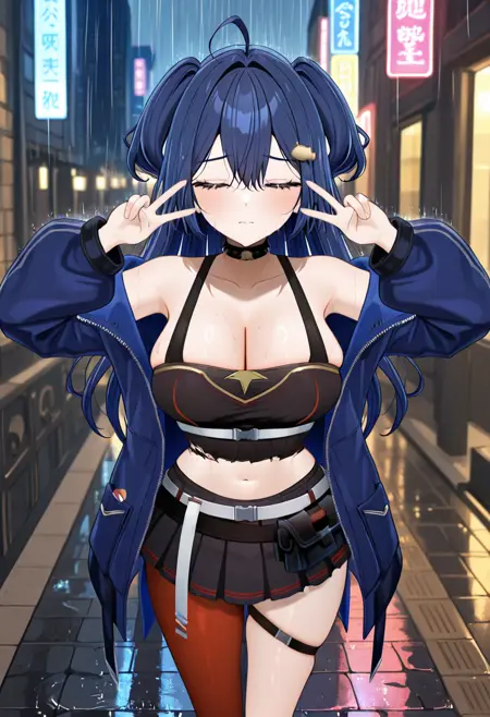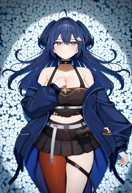 옷 프롬프트: 검은 셔츠, 어깨 드러냄, 어깨 노출, 파란 재킷, 벨트, 한쪽 다리용 스타킹, 한쪽 허벅지 롱 스타킹, 비대칭 다리 착용, 허벅지 스트랩, 부츠