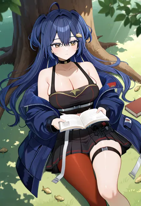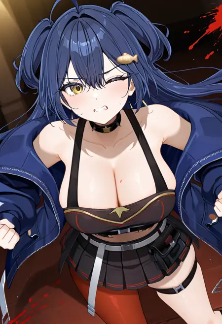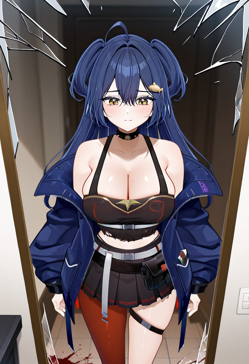 옷 프롬프트: 검은 셔츠, 파란 재킷, 검은 콜라르, 귀骨, 검은 치마, 한쪽 다리용 스타킹, 허벅지 스트랩, 부츠