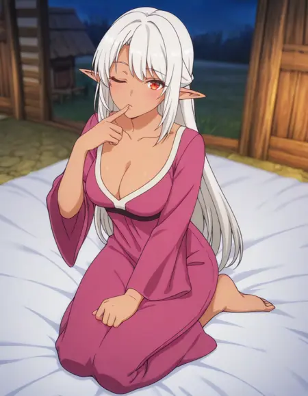<lora:silk_amberwood-aparida_s1-v2-ixl-anime-soralz:1>, silk amberwood (aparida), dark elf, long hair, silver hair, pointy ears, orange eyes