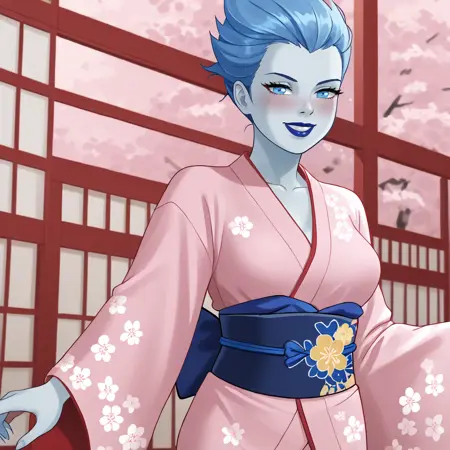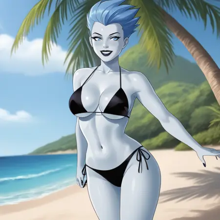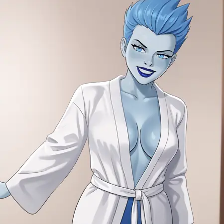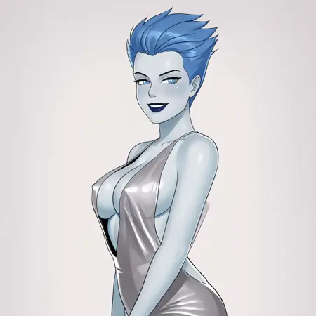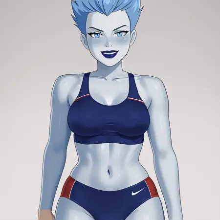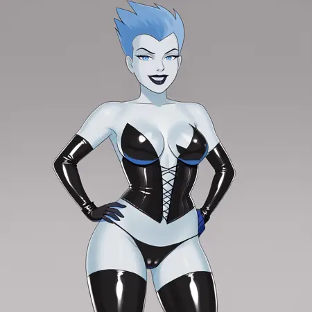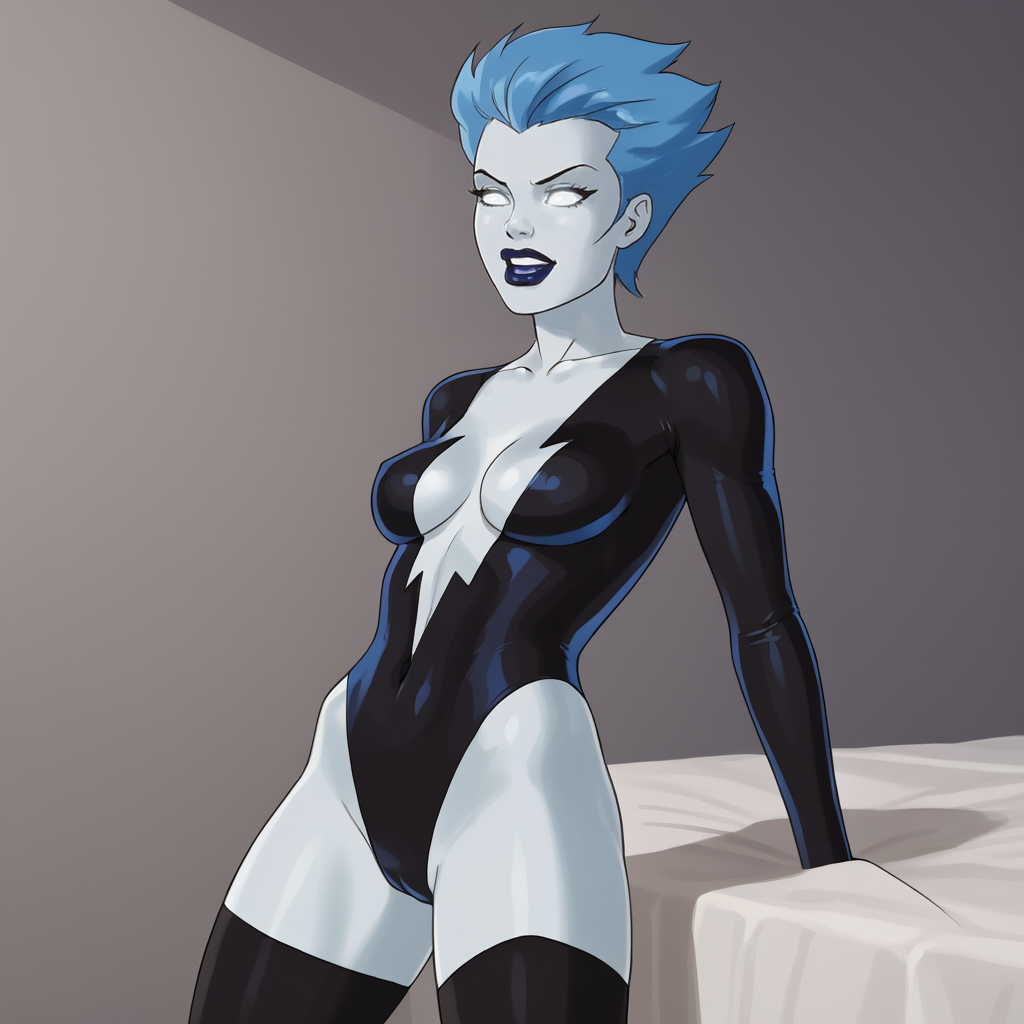 - トリガー:Livewire, 1girl, 中程度の胸, 黒色のスタッキング, 青色の手袋, 黒色のレオタード, 青色の唇, 青色の髪, リップスティック, 青色の肌, メイク, 青色の目, ハイレグレオタード, 锁骨, 股間, 短い髪, 裸の腰