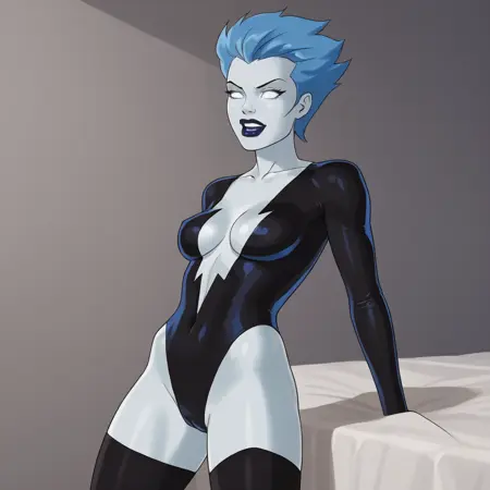 트리거: Livewire, 1girl, 중간 크기 유방, 검은 허벅지 스타킹, 파란 장갑, 검은 레오파드, 파란 입술, 파란 머리, 립스틱, 파란 피부, 메이크업, 파란 눈, 하이레그 레오파드, 목뼈, 생식기, 단발, 벌거벗은 골반
