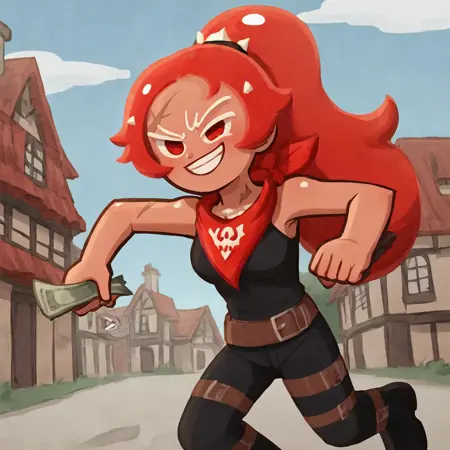 马尾辫,深色皮肤,红发,长发,脸上有疤痕,红眼睛,腰带,脖子上系着骷髅图案的红色手帕,马尾辫,深色皮肤,红发,长发,脸上有疤痕,红眼睛,腰带,脖子上系着骷髅图案的红色手帕,