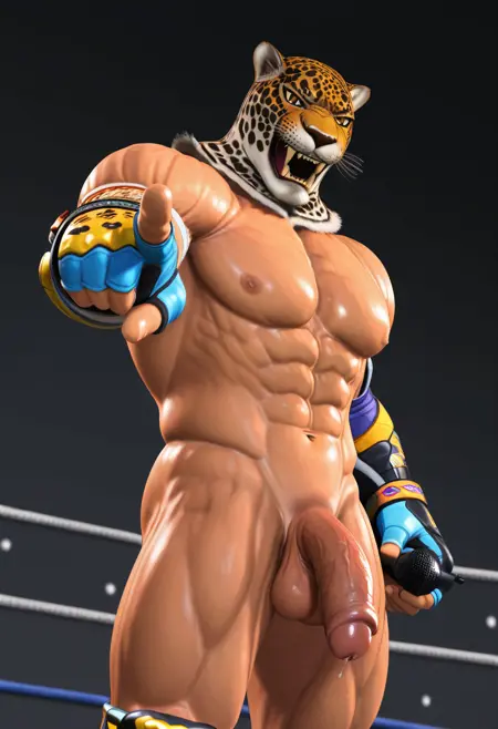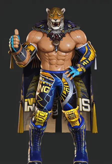 | 训练词汇 | king (tekken), muscular male, jaguar head mask, brown nose, whiskers, hazel eyes, jaguar teeth, jaguar tongue, jaguar tail, pectorals, nipples, abs已复制! medallion necklace with jewels, patterned feather cape, patterned armband, blue and yellow pantyhose, turquoise and black fingerless gloves, blue and yellow kneepads, blue and yellow boots,已复制! |