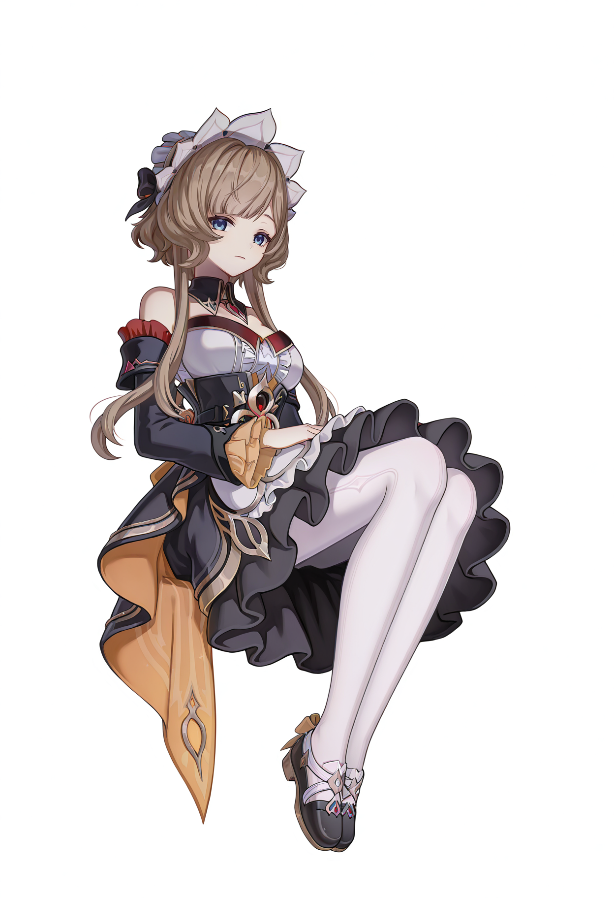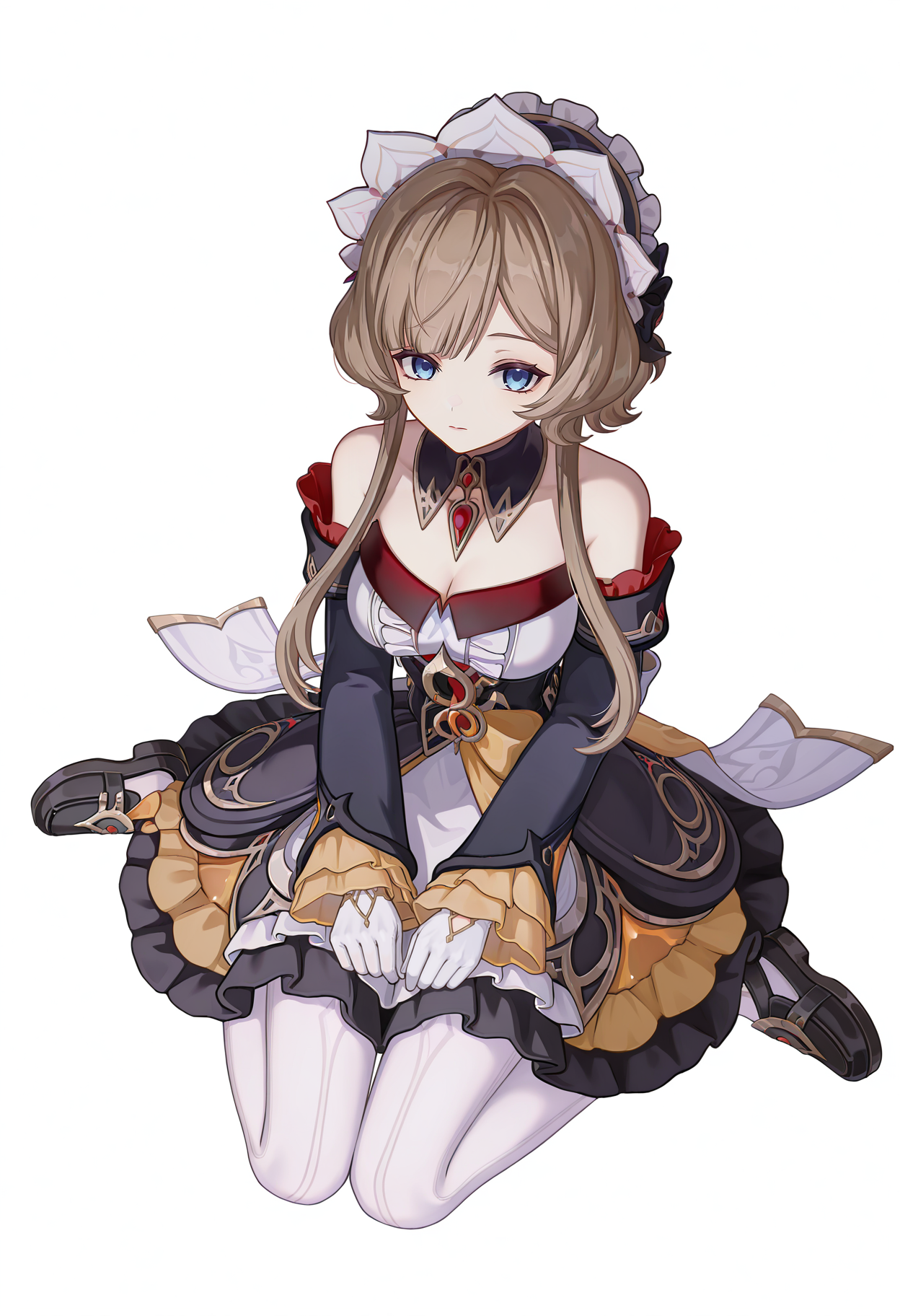 black footwear,white pantyhose,black dress,long sleeves,bare shoulders,detached sleeves,breasts,maid headdress,frills,white gloves,