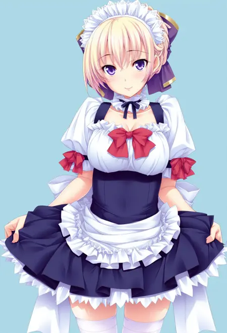 트리거 단어: c-feli, 금발, 보라색 눈, 짧은 머리, 머리 높이 올리기, 머리리본, 메이드, 메이드 헤어캡,
