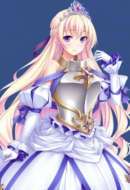 의상: 티아라, 갑옷 드레스, 가슴갑옷, 분리형 소매, 긴 드레스, 풍성한 소매, 흰 장갑,
