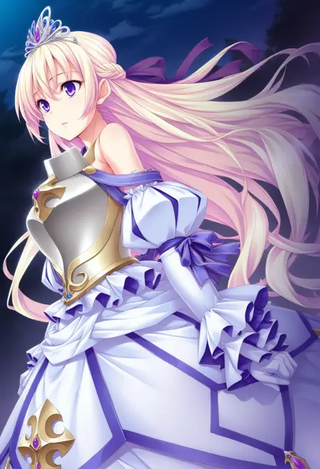 Clothing: tiara, armored dress, breastplate, detached sleeves, long dress, puffy sleeves, white gloves,