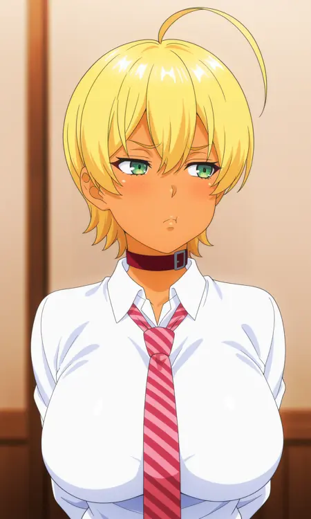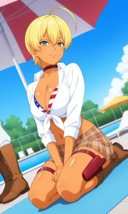 | 训练词汇 | m1to1kmfwdef, green eyes, blonde hair, hair between eyes, ahoge, short hair, dark-skinned female, red choker, belt collar, white shirt, collared shirt, tied shirt, cleavage, collarbone, midriff, bikini top only, american flag bikini, flag print, navel, linea alba, brown skirt, plaid skirt, pleated skirt, miniskirt, striped necktie, red thigh holster, brown footwear, brown boots,已复制! |