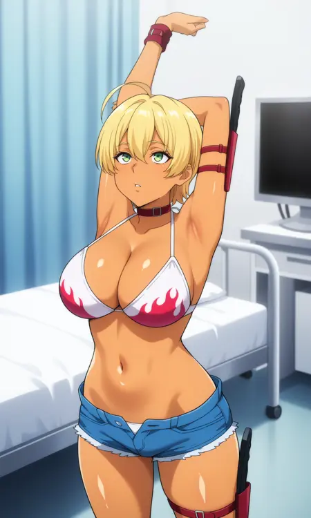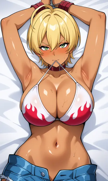 | 训练词汇 | m1to1kmfwfbk, green eyes, blonde hair, hair between eyes, ahoge, short hair, dark-skinned female, red choker, belt collar, collarbone, bikini top only, white bikini, flame print, large breasts, cleavage, navel, linea alba, red arm holster, red wristband, denim shorts, micro shorts, open shorts, cutoffs, red thigh holster, knife,已复制! |