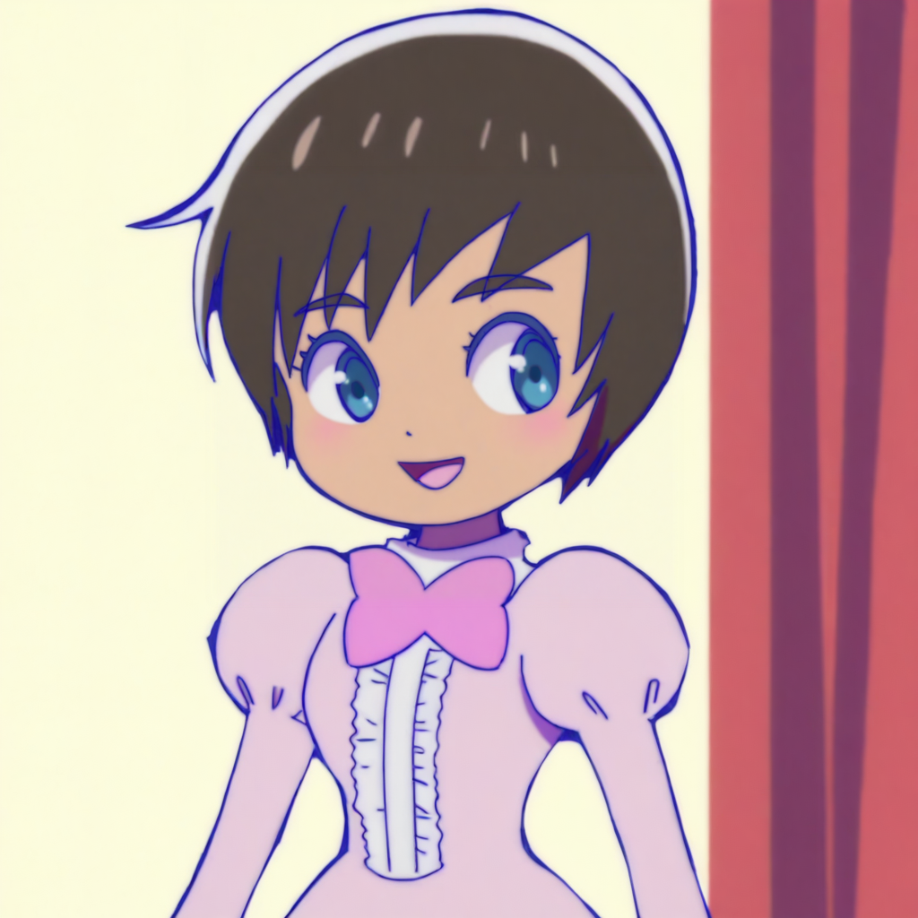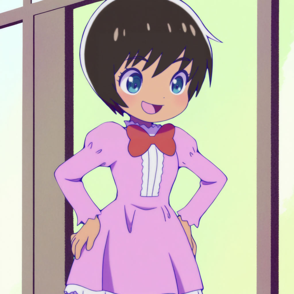 kinko, 1girl, solo, short hair, open mouth, dress, brown hair, bow, smile, long sleeves, kinkdress
