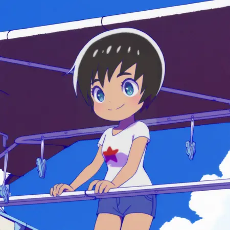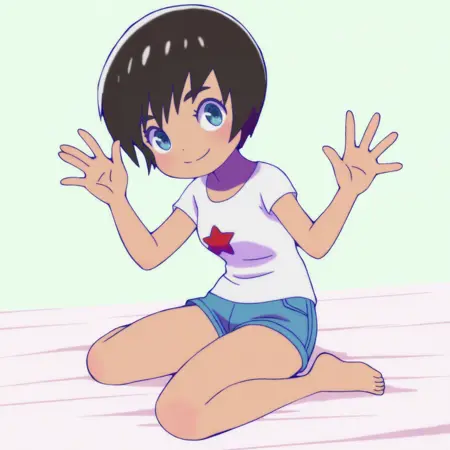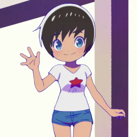 kinko, solo, shirt, 1girl, short hair, smile, white shirt, t-shirt, blue shorts,