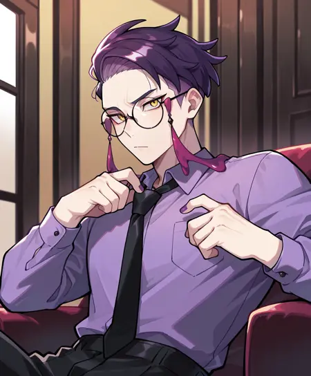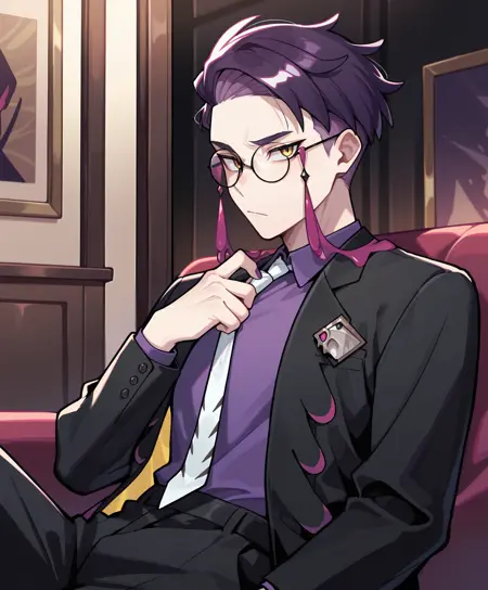 カラス、黄色い目、紫の髪、紫の爪、ズボン、黒いズボン、眼鏡、