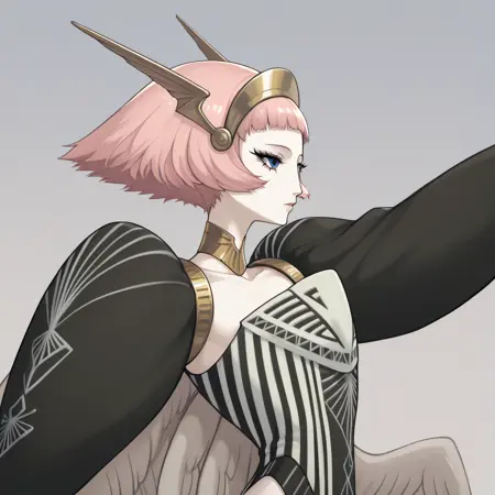 복장은 날개 모양 헤어밴드, 목걸이, 레오타드, 부푼 소매, 분리형 소매로 이루어져 있다.