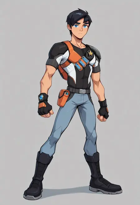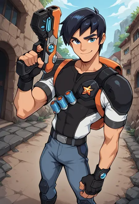 eli shane, slugterra, 蓝眼睛,黑发,衬衫(黑、橙、白),shane标志,蓝色长裤带膝垫,黑色靴子,无指手套,黑色手套,手套,背包,胸前带蛞蝓的胸带,蛞蝓收纳器,肘垫,武器,枪,手持武器,手持枪,肩上有动物,服装细节丰富,未来感装备
