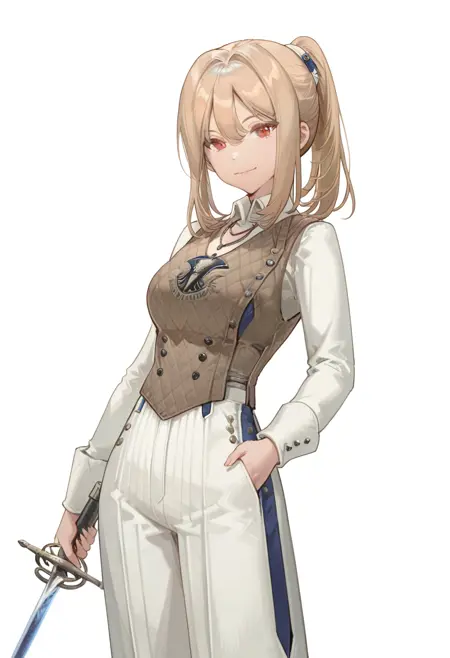白い袖、茶色のベスト、長袖、金髪、赤い目、ほくろ、ポニーテール、白いズボン、武器を握っている、lora:reverse_1999_Tennant:0.8