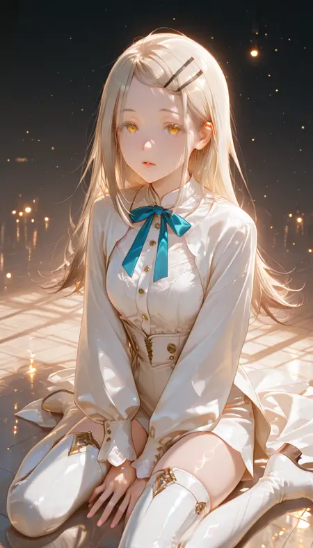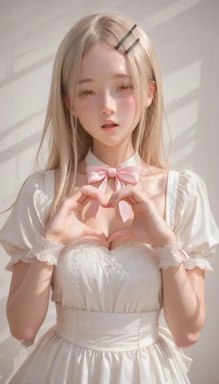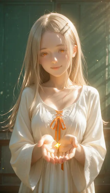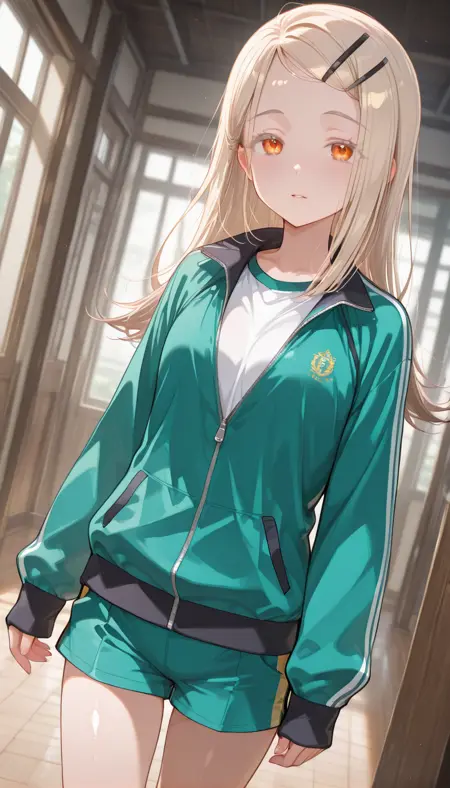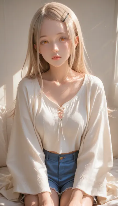 IMShinoHiro, 긴 머리, 금발, 머리 장식, 머리핀, 주황색 눈, 연한 갈색 머리, 갈라진 앞머리, 가슴, 작은 가슴, 스윕 앞머리,