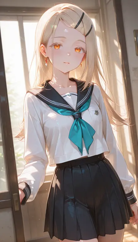 셔츠, 치마, 긴 소매, 보석, 학교 복장, 흰 셔츠, 귀걸이, 주름 치마, 세라후쿠, 검은 치마, 선원칼라, 넥커치프, 피어싱, 귀 피어싱, 검은 선원칼라, 파란 넥커치프, 아쿠아 넥커치프, 귀골, 허벅지,