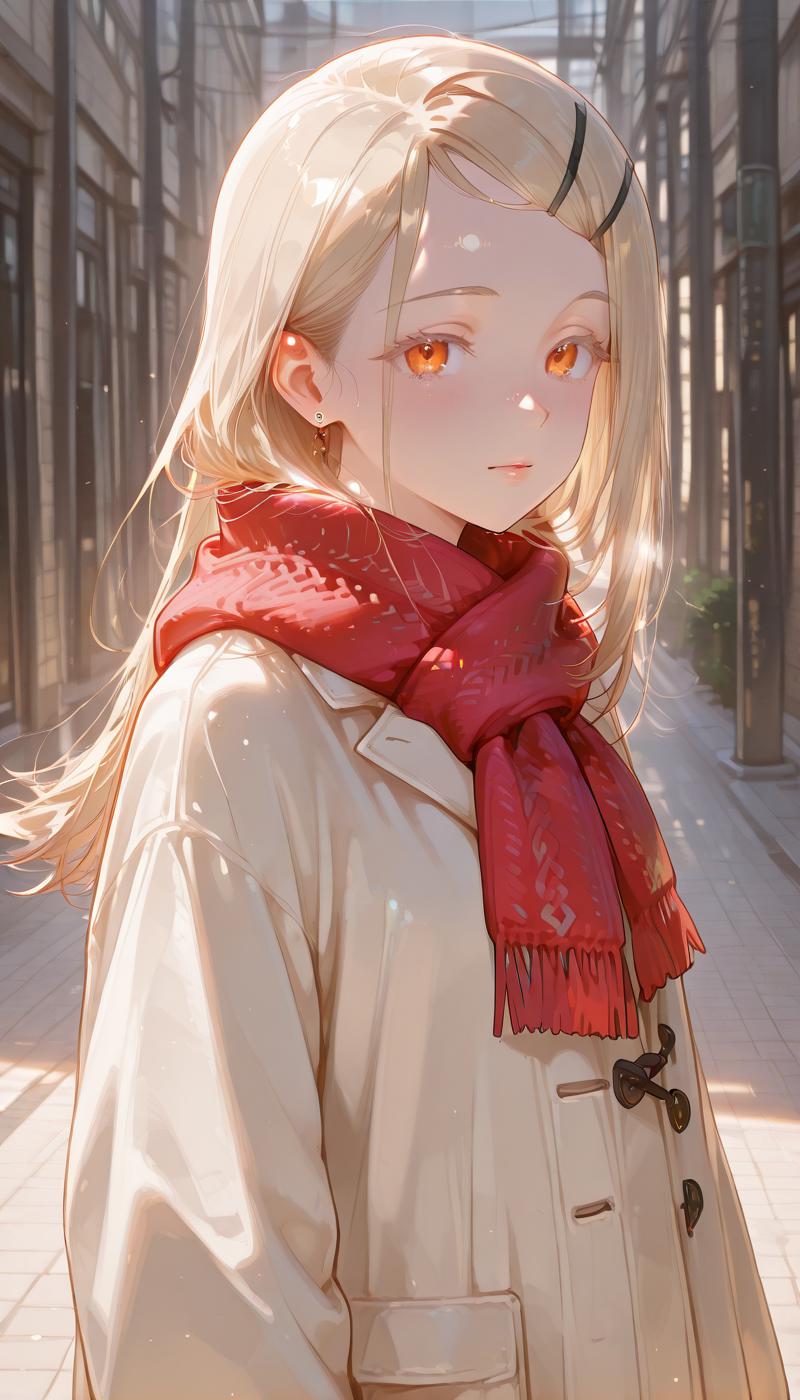 2. 긴 소매, 보석, 귀걸이, 스카프, 코트, 버튼, 빨간 스카프, 흰 코트, 겨울 옷, 갈색 코트, 프린지 트림, 겨울 코트, 더펠 코트,
