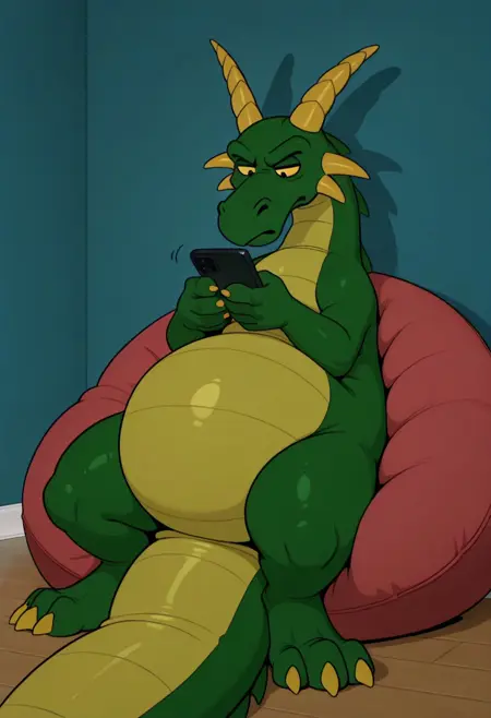 ScoobyDragon, dragon, green body, light green belly, dark yellow horns, dark yellow claws, yellow sclera, bottom heavy, semi-anthro