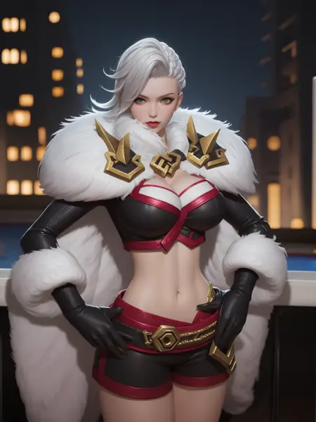 - WZRYzhongwuyanYP, 1girl, solo, breasts, armor, makeup, shoulder armor, midriff, cleavage, large breasts, shorts, looking at viewer, fur trim, gloves, white hair, asymmetrical hair, belt, aqua eyes, eyeshadow, long sleeves, fur collar, cityscape, night, mature female, pool, hand on hip, fur-trimmed cloak,