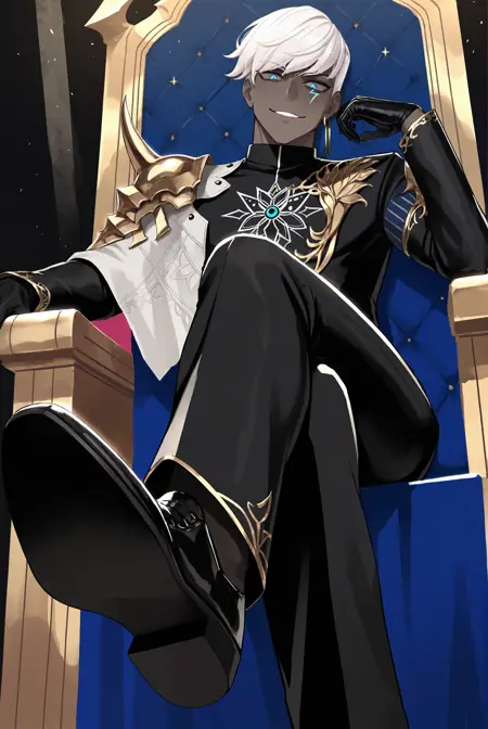 1ndra, 흰 머리카락, 파란 눈, 귀걸이, 보석, 검은 피부 남성, 검은 피부, 단발, 얼굴 문신, 장갑, 갑옷, 재킷, 검은 바지, 검은 신발