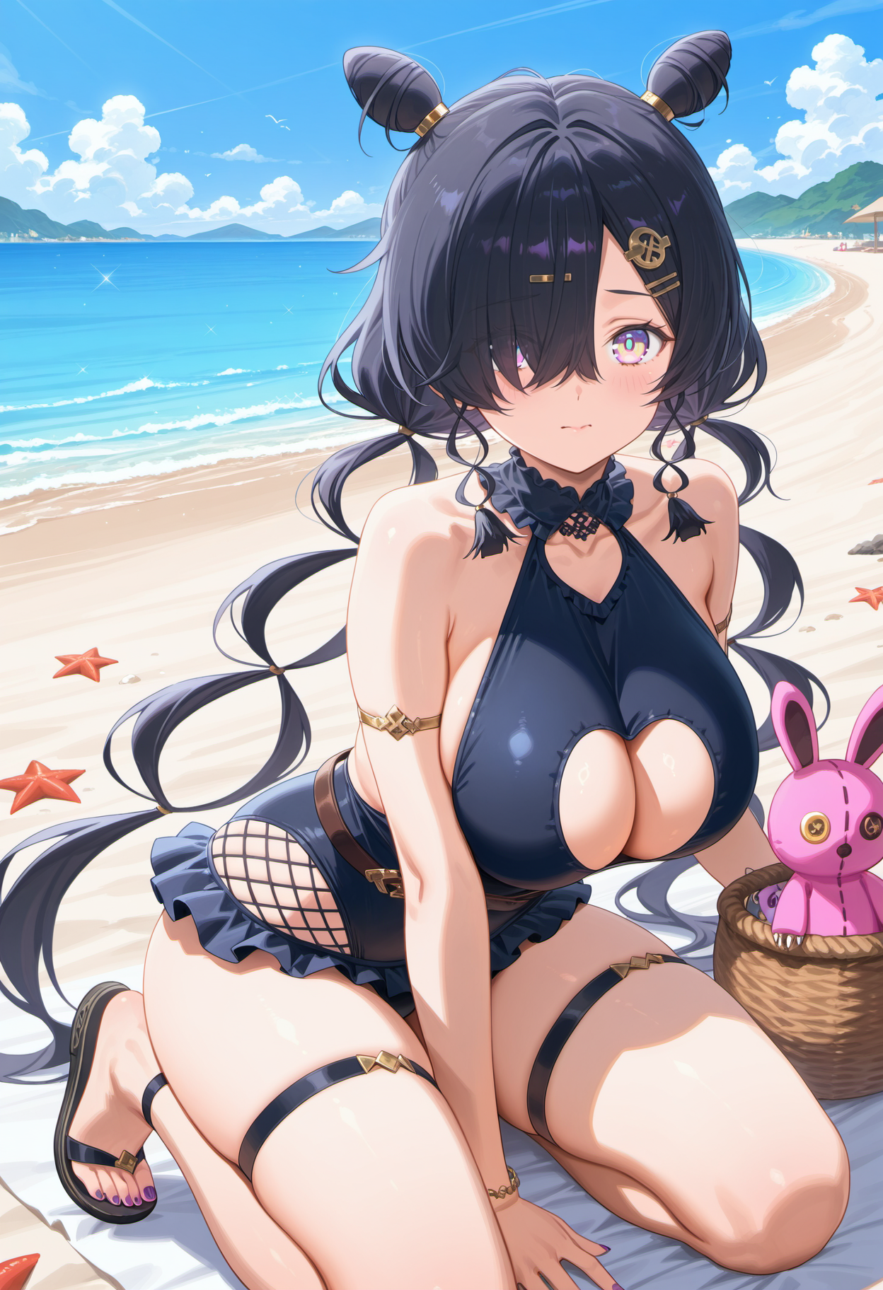 antjeswim,黑发,超长发,头发遮住一只眼睛,锥形发髻,双发髻,低双马尾,发饰,紫色眼睛,黄色瞳孔,多色眼睛,大胸部,黑色连体泳衣,领口,露胸剪裁,渔网袜,荷叶边,臂环,手镯,指甲油,紫色指甲,
