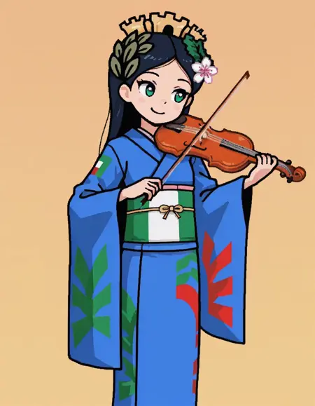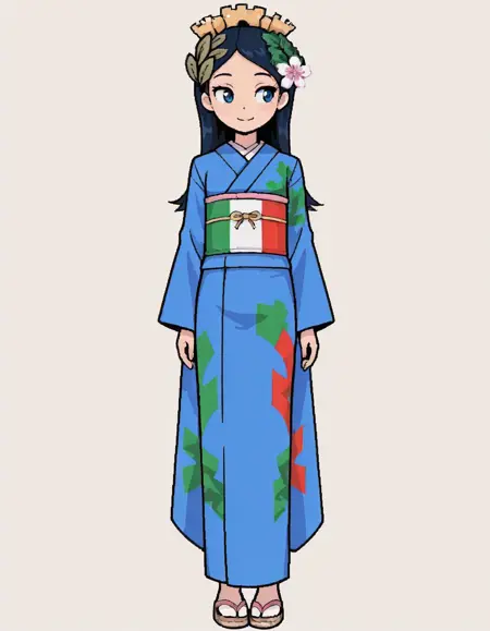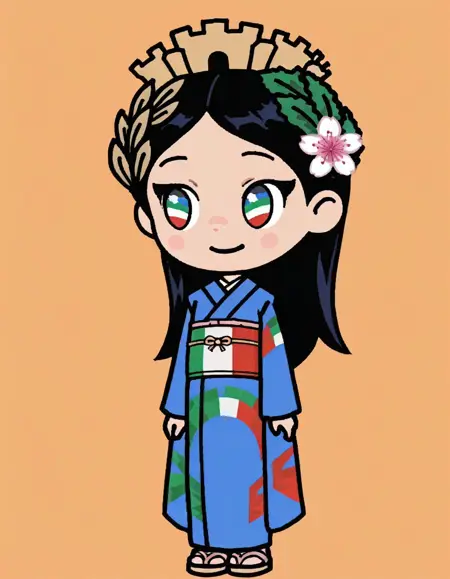 italiachan, kimono, long hair, chibi, hair ornament, italian flag, blue kimono, hair flower, symbol-shaped pupils