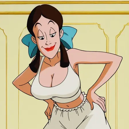 Undressed prompt: hortensepickeringttlgo, tall and slim female, dark brown hair, 4 hair dreads, small black eyes, red lips, big breasts, blue hair ribbon, white tank top, white bloomers pants, cleavage