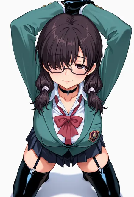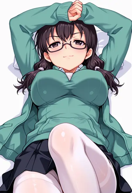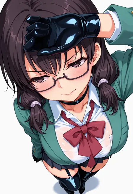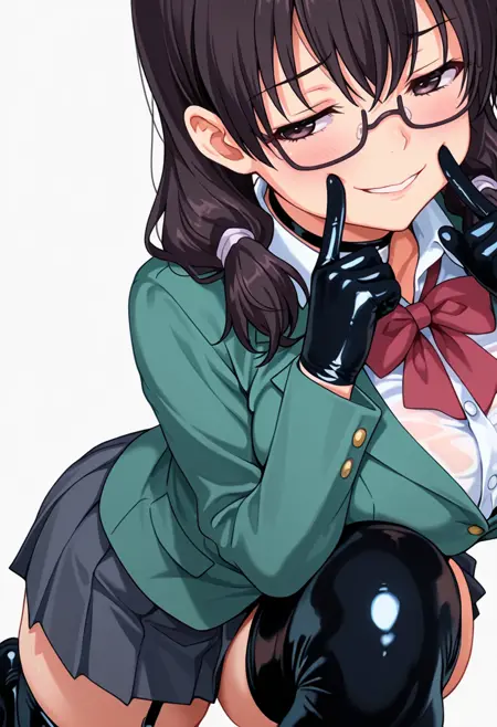 seika_cnr, 1girl, black hair, twintails, black eyes, glasses, large breasts, naughty face, skindentation,