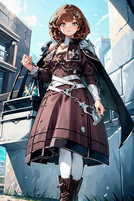 茶色の髪、短髪、星の髪飾り、緑の目、片肩パッド、ステラネックレス、ビーズネックレス、黒いマント、