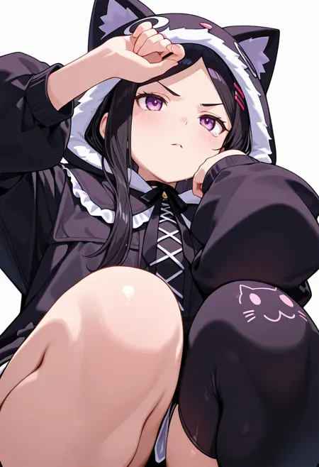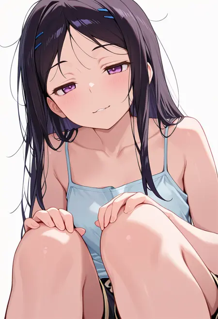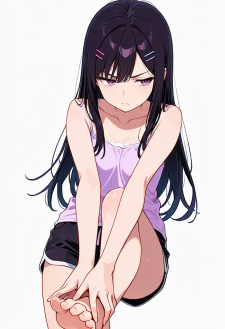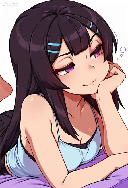 ami_cnr, 1girl, black hair,long hair, bangs, purple eyes, hairclip,