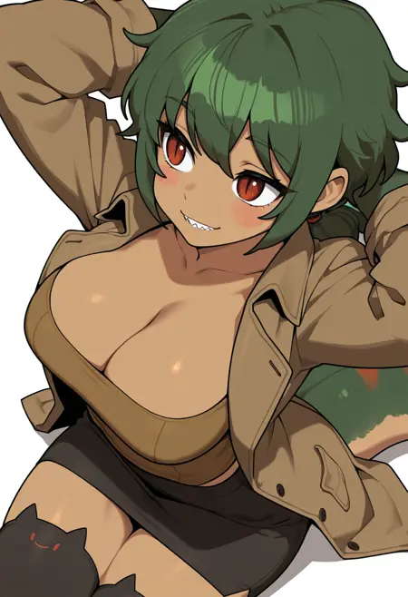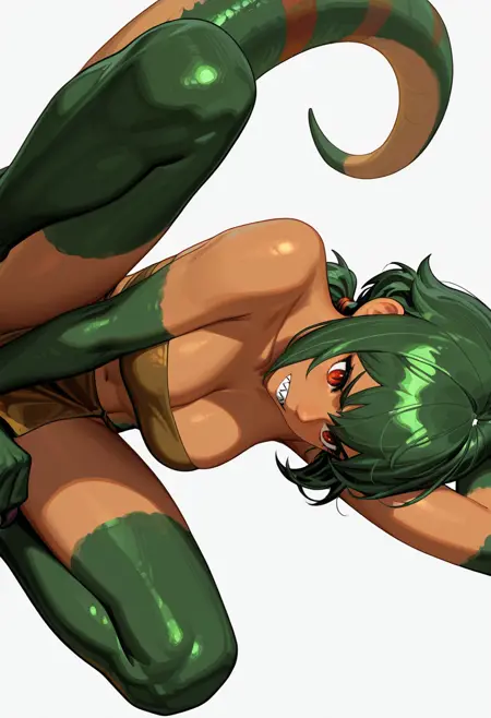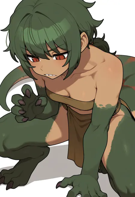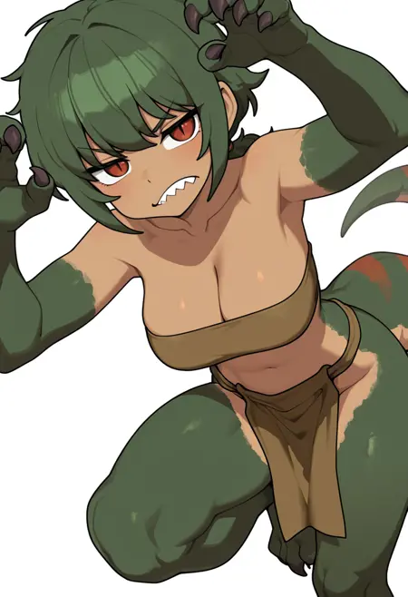 dino_cnr, 1girl,monster girl, green hair,low ponytail, short hair,dark-skinned female, green skin, scales, red eyes, slit pupils, sharp teeth,claws,lizard tail,