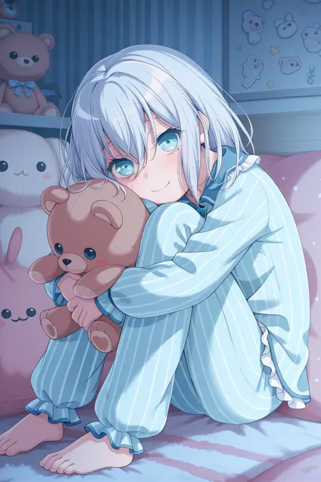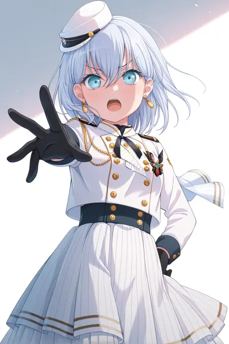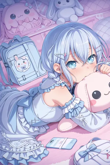 kuratamashiro, 1girl, solo, dress, long sleeves, ribbon, striped, blush, parted lips, blue dress, vertical stripes, striped dress, hair between eyes, neck ribbon, bangs, vertical-striped dress, short hair, looking at viewer, breasts, layered sleeves, frills, puffy sleeves, cslsk