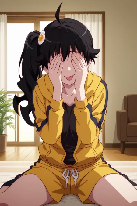 aakaren, 黒い目, 黒い髪, 片側ポニーテール, アホ毛, karenc1, 卵型髪飾り, 黒いシャツ, 黄色のジャケット, トラックジャケット, フード下ろし, 黄色のショートパンツ, ジムショートパンツ, アニメ風カラーリング,