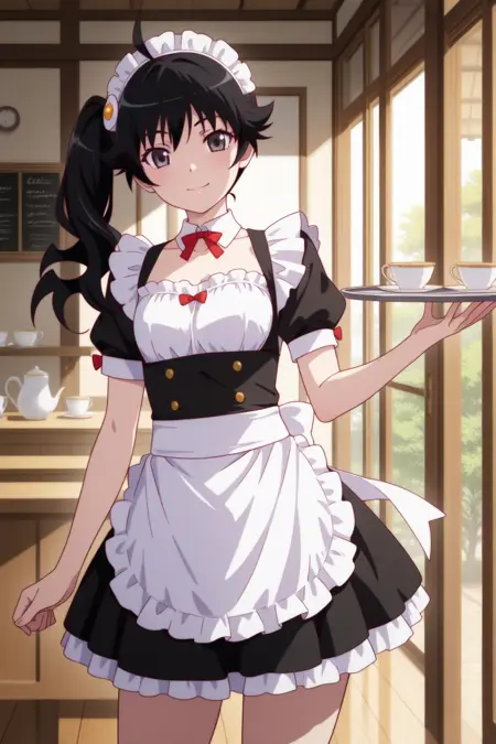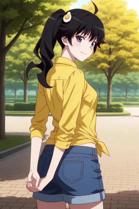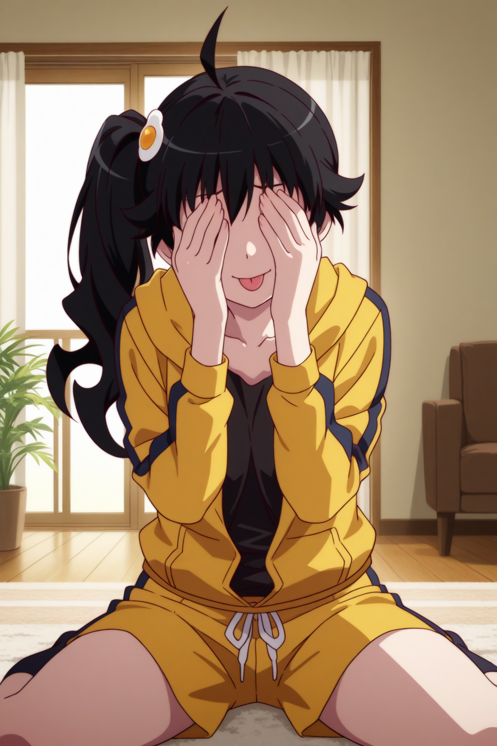aakaren, 검은 눈, 검은 머리, 옆머리 폰테일, 아호게, karenc1, 계란 머리 장식, 검은 셔츠, 노란 재킷, 트랙 재킷, 후드 아래로, 노란 반바지, 운동 반바지, 애니메이션 컬러링,