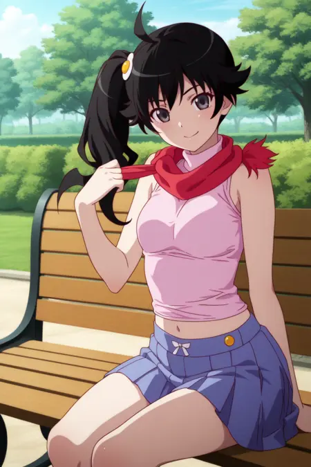 aakaren, 검은 눈, 검은 머리, 옆머리 폰테일, 아호게, karenc2, 계란 머리 장식, 빨간 스카프, 핑크 탱크 탑, 터틀넥, 복부, 파란 치마, 주름 치마, 애니메이션 컬러링,