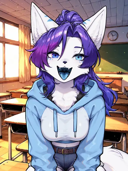 일반: 1girl, solo, furry, furry female, fox girl, body fur, white fur, two-tone fur, animal ears, animal ear fluff, fox ears, animal nose, long hair, multicolored hair, two-tone hair, blue hair, purple hair, heterochromia, blue eyes, breasts, medium breasts, nail polish, blue nails, tail, fox tail