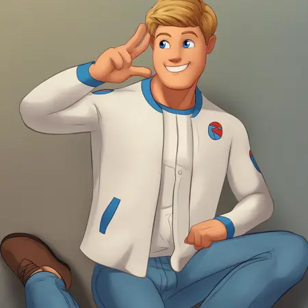 zzfr3dj0n3szz, 1boy, solo, male focus, blue eyes, blonde hair, short hair, white shirt, white jacket, jeans, shoes, brown footwear