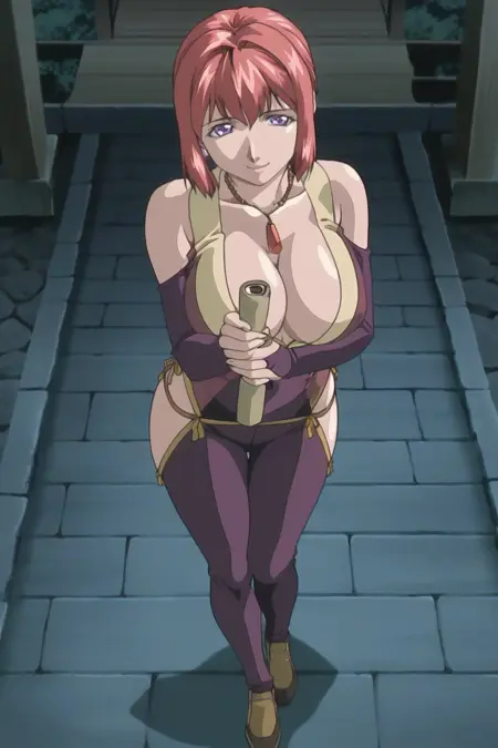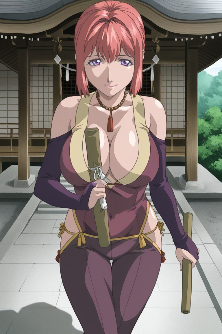 new_bible_black_style, new_bible_black_for_hiroko_takashiro, 紫色の目, 赤髪, 短髪, ペンダント, 大きい胸, 锁骨, 腹臍が隠れている, 胸元の開き, 笑顔