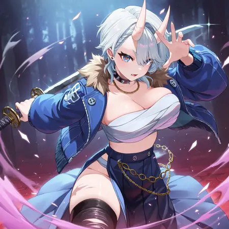 chain necklace, blue jacket, fur-trimmed jacket, chest sarashi, chain, blue skirt, side slit, torn thighhighs