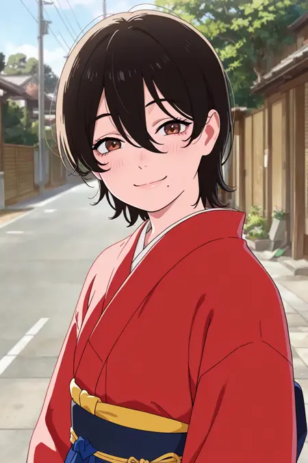 京本(Kyomoto)的角色特征:1girl, black hair, hair between eyes, mole under mouth