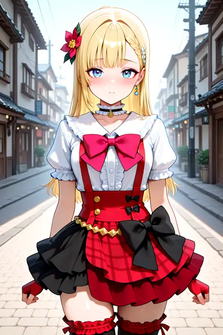 RFGoA_Clar, long hair, blue eyes, blonde hair, braid, blunt bangs, breasts, makeup, eyeshadow, hair flower