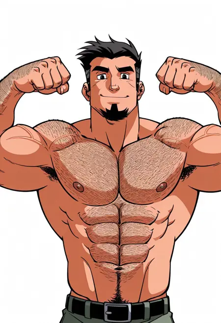프롬프트: TripCC, 검은 머리, 짧은 머리, 갈색 눈, 안면 털, 근육질 남성, 가슴 근육, 가슴 털, 팔 털, 몸 전체 털, 갈색 셔츠, 소매 없음, 벨트, 갈색 바지,